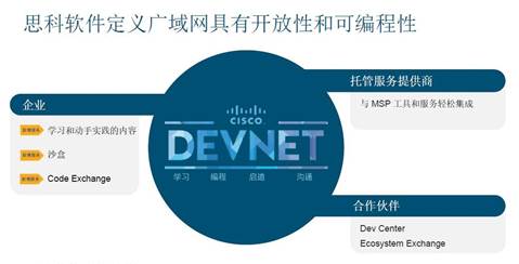 除了提供卓越的安全和應(yīng)用體驗(yàn)外,思科SD-WAN還具備開放性與可編程性。曹圖強(qiáng)表示,“首先,思科將通過 DevNet 開發(fā)平臺向所有用戶開放API,為開發(fā)人員提供更大價值;其次,對合作伙伴而言,思科希望提供一個可交互的平臺幫助用戶進(jìn)行分享。任何用戶有特殊的需求,可以在DevNet 與大家分享。具體來說,在整個安全的廣域網(wǎng)部署中, IT人員可以通過開放的平臺,根據(jù)不同的環(huán)境和需求進(jìn)行二次開發(fā)!