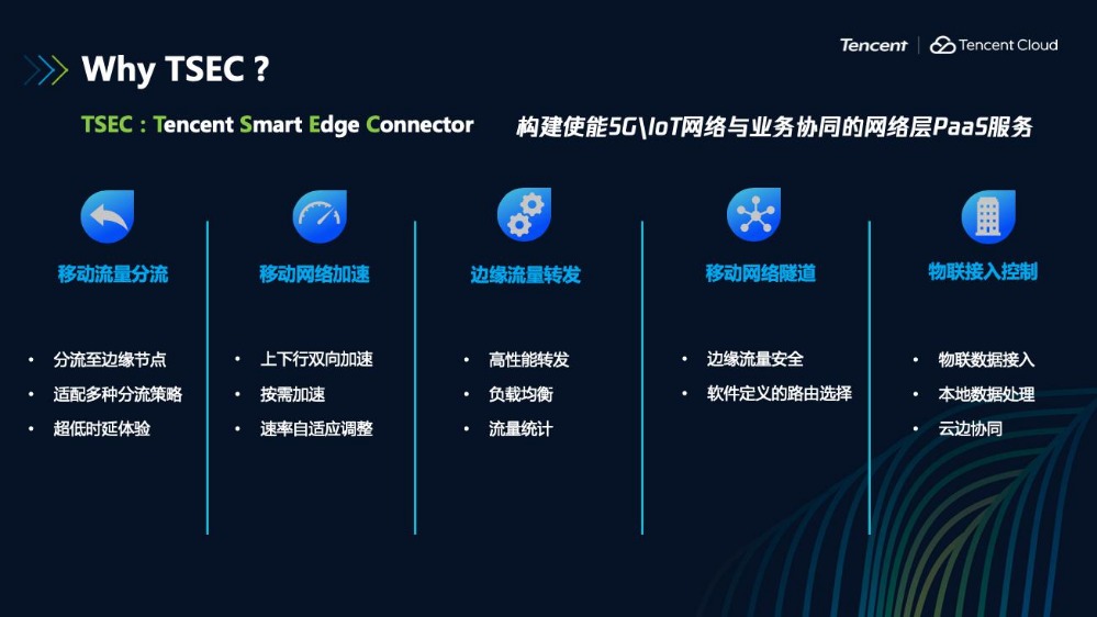 騰訊TSEC致力于構(gòu)建使能5G/IoT網(wǎng)絡(luò)與業(yè)務(wù)協(xié)同的網(wǎng)絡(luò)層PaaS服務(wù),具備移動(dòng)流量分流、移動(dòng)網(wǎng)絡(luò)加速、邊緣流量轉(zhuǎn)發(fā)、移動(dòng)網(wǎng)絡(luò)隧道、物聯(lián)接入控制等核心功能。作為5G網(wǎng)絡(luò)與業(yè)務(wù)的橋梁,TSEC豐富的移動(dòng)組件可以連接移動(dòng)用戶、運(yùn)營商5G網(wǎng)絡(luò)和應(yīng)用,為高價(jià)值用戶和業(yè)務(wù)提供可自定義的、高質(zhì)量的、差異化的邊緣計(jì)算網(wǎng)絡(luò)服務(wù),實(shí)現(xiàn)應(yīng)用在云、邊、端的友好協(xié)同。