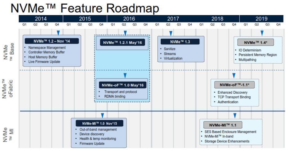 第一個(gè)NVMe規(guī)范逐漸增加了更新的功能——1.2版本中的實(shí)時(shí)固件更新和1.3版本中的清理功能已經(jīng)在SCSI和SATA中很常見了。明年年中推出NVMe 1.4版本將增加IO Determinism功能,以確保跨網(wǎng)絡(luò)和存儲(chǔ)的緊密且一致的延遲。同時(shí),新增的管理規(guī)范也提供了管理設(shè)備機(jī)箱的能力。