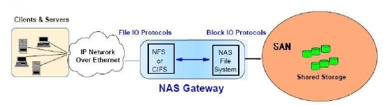 上的SAN上,使的SAN的大容量存儲(chǔ)空間可以為NAS所用。因此,NAS網(wǎng)關(guān)后面的存儲(chǔ)空